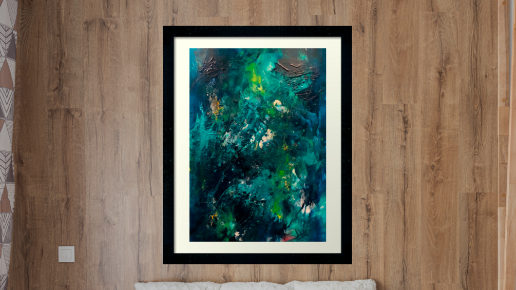 Color print, abstract art, lyrical abstraction, PRINTABLE, with blue and green, environment with elegance, serenity and harmony.